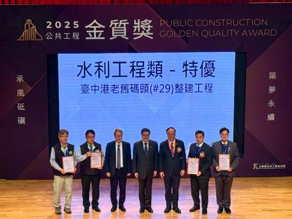 【視傳媒記者吉雄世高雄報導】行政院公共工程委員會於115年1月21日舉辦「第25屆公共工程金質獎」頒獎典禮,特邀行政院卓榮泰院長蒞臨頒獎。臺灣港務公司秉持「安全、品質、永續」的工程核心理念,於本屆公共工程金質獎再創佳績,以「臺中港老舊碼頭(#29)整建工程」榮獲特優獎,「花蓮港#17~#25碼頭震災修復工程」榮獲優等獎,由周永暉董事長代表領獎。公共工程金質獎為國內公共工程最高榮譽獎項,本次獲獎充分展現臺灣港務公司在工程品質、施工管理及創新技術應用上的卓越成果。