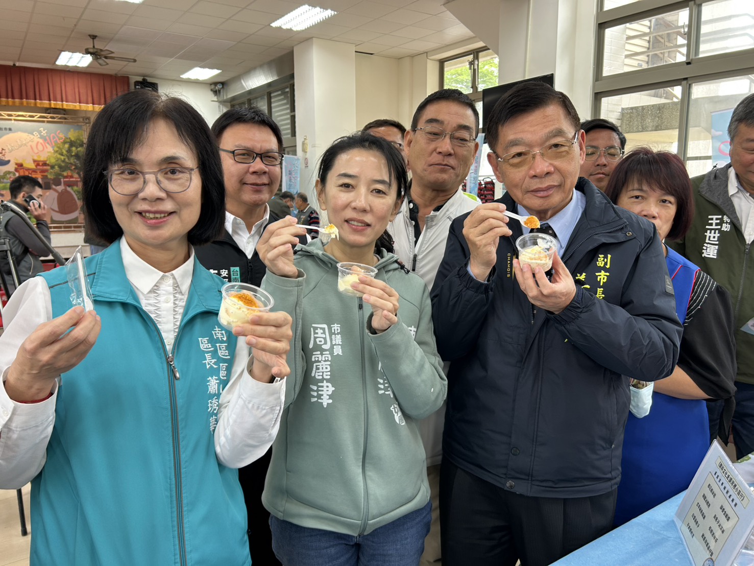 ▲副市長姜淋煌及南區區長蕭琇華歡迎民眾來南區2026樂活鯤喜灣活動吃喝玩樂。(記者黃雋淮 攝)