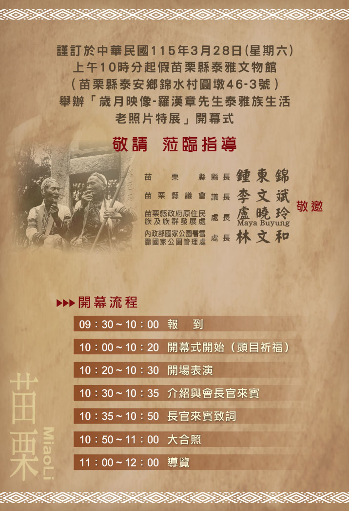 苗栗縣泰雅文物館將於115年3月28日起至5月31日舉辦為期2個月辦理「歲月映像-羅漢張先生泰雅族生活老照片」特展,於3月28日上午10時隆重開幕,誠摯邀請您蒞臨參觀,並欣賞歷史老照片的點點滴滴。