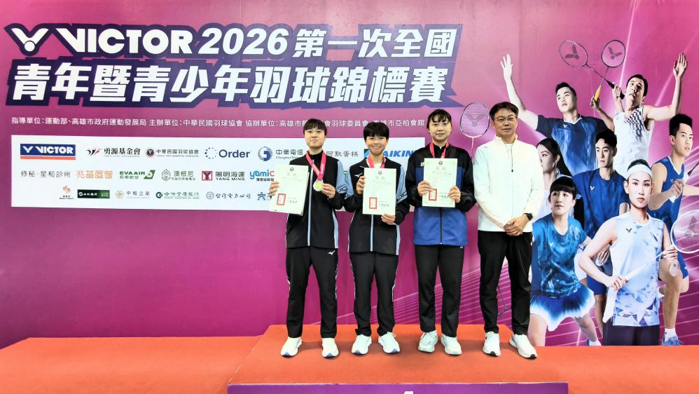 ▲2026第一次全國青少年羽球分齡排名賽4月5日進行各級別的會內賽,經過激烈廝殺,U19女單成績出爐,由中華羽協秘書長林怡男(右1)頒獎。(圖/中華羽協提供)